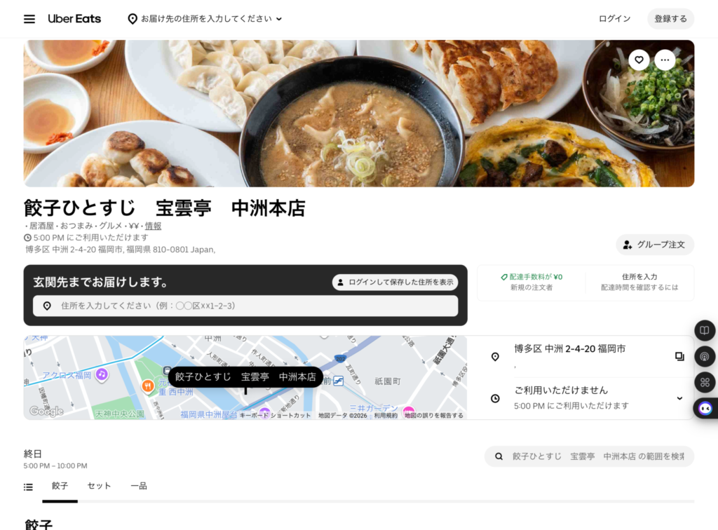 宝雲亭 中洲本店で長らく休止していました UberEats によるご注文受付を再開しました。対象エリアのお客さまは店舗までご足労いただくことなく、博多一口餃子や復刻一口餃子を始めとする宝雲亭の多くのメニューをお楽しみいただけます。ご自宅や滞在先で、ぜひ宝雲亭をお楽しみください。